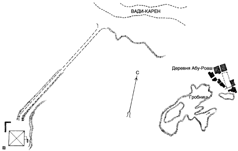 Несколько разбросанных блоков известняка немного к западу от современной деревни Абу-Роаш, возможно, отмечают все еще нераскопанный нижний храм. Отсюда начинается, возможно, одна из самых великолепных дорог к пирамидам (рис. 36). Эта восхитительная постройка длиной 1,5 километра идет на юго-запад и поднимается на высоту около 12 метров над пустыней, где соединяется с плато. Мы не знаем, была ли она огорожена стеной или крышей, поскольку подробных исследований еще не проводилось. Как и в случае с Ломаной пирамидой в Дахшуре, дорога, судя по всему, кончалась близ северо-восточного угла ограды пирамид; только северо-западный угол стены теменоса сохранился до сих пор.