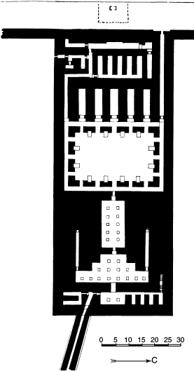 Заупокойный храм Хафры – это большое и величественное здание, которое было раскопано экспедицией фон Зиглина в первые годы XX в. Хотя храм и лежит в руинах, он все еще окружен атмосферой торжественного величия, и его план легко различим (рис. 39). Строение мало напоминает своего предшественника, заупокойный храм Хуфу, и еще меньше – маленькие молельни Снофру и Ху. Какое-то неизвестное нам изменение в заупокойном культе царя должно было повести к таким радикальным изменениям в плане храмов при пирамидах.