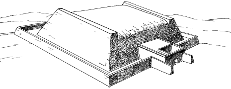 Самая западная из малых пирамид, также 9 метров высотой с длиной стороны 36 метров (рис. 45), была построена с заполненными слоями из больших блоков местного известняка. Опять-таки здесь нет никаких следов облицовки. Ее вход сейчас заблокирован. Он вел в спускающийся вниз коридор, прихожую и погребальную камеру. Очевидно, здесь не было найдено никаких следов погребения, и вполне возможно, что это вспомогательная пирамида комплекса Менкауры. Как у двух других, у этой пирамиды была небольшая молельня из глинобитных кирпичей на восточной стороне.