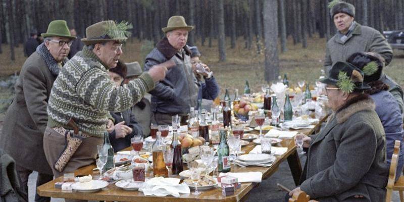На месте нас ждет банька, где егеря отводят душу, хлеща во всю мочь тушки лидера кубинских революционеров и главы советских коммунистов. Затем мы пьем много чая и садимся обедать чем бог послал. А послал он супчик из тетеревов, жаркое из дичи и большие пироги с ягодами. Фидель в пище неприхотлив. В свою прошлую поездку по СССР ел борщ и сало со свинаркой Марией в украинском селе, пил с геологами водку из бутылки. Фидель отдавал должное русским блюдам – солянкам, борщам, котлетам, пирогам. И особенно ему понравился цыпленок Тапака.