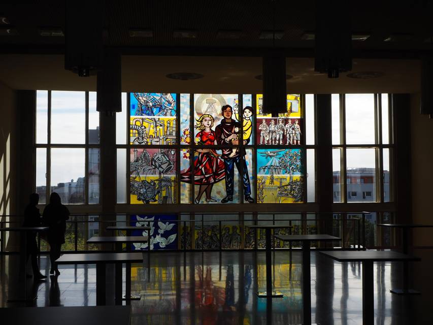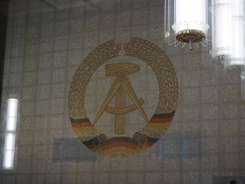 По пути внимательно рассматриваю интерьеры. А интересно! Мейсенская фарфоровая плитка на стенах, красные ковры и стеклянные панели, почти церковные витражи со сценами жизни рабочих и крестьян, постоянные намеки на дружбу с СССР и совершенно космические по дизайну светильники. Аж засмотрелся. Шепчу Голикову, что следует рядом: