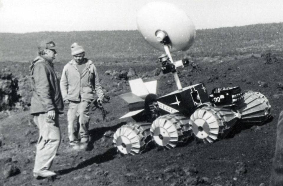 По размерам луноход сопоставим с современным легковым автомобилем, но на этом сходства заканчиваются и начинаются различия. Мне их тут же поясняют инженеры корпорации. Колёс у лунохода восемь, причём у каждого из них свой собственный привод, что обеспечивало аппарату вездеходные качества. Луноход мог двигаться вперёд и назад с двумя скоростями и делать повороты на месте и в движении. В приборном отсеке, в так называемой «кастрюле» размещается аппаратура бортовых систем. Солнечная батарея откидывается, как крышка рояля, днём и закрывалась ночью. Она обеспечивает подзарядку всех систем.