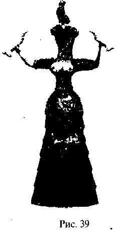 Не сможем ли мы найти недостающие факты в истории богов? Как мы уже говорили выше, микенцы поклонялись богине Инанне. Она выступала на стороне Энлиля и была противницей богов из партии Энки. Возможно, Крит был прежде опорным пунктом сторонников Энки? В пользу такого предположения говорит новая религия Крита: ее символом является изображение богини с обнаженной грудью, держащей двух змей. На рис. 39 представлена статуя из Кносса, изображающая богиню, которая одержала победу на Крите над змеиными богами – сторонниками Энки. Что касается мотивов, которыми руководствовалась Инанна, то разрушение города Мари войском Хаммурапи явно было эпизодом междоусобицы, но, может быть, для этого был еще какой-нибудь непосредственный мотив? Крито-минойская культура оставила нам возможный вариант решения этого вопроса в одной из самых впечатляющих легенд древнего мира – в легенде о Минотавре. Минотавр, получеловек-полубык, был будто бы зачат женой царя Миноса от быка. Но если мы сочтем быка символом одного из богов партии Энлиля, то тогда станет ясно, что в этой легенде речь идет о заточении в лабиринте не Минотавра, а обычного бога из плоти и крови. В греческом повествовании о Тесее и Минотавре содержится упоминание о том, что тогда был сожжен царский дворец, и в связи с этим возникает предположение, что этот рассказ был навеян эпизодом с разрушением дворцов в 1450 году до РХ. Повествование было украшено описанием мифического животного, но в действительности оно могло основываться на реальном факте – попытке Инанны вторгнуться, чтобы выручить плененного бога.