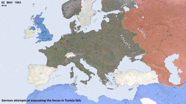 Положение дел в Европе, на 2 мая 1943, цифры обозначают численность армейских группировок.