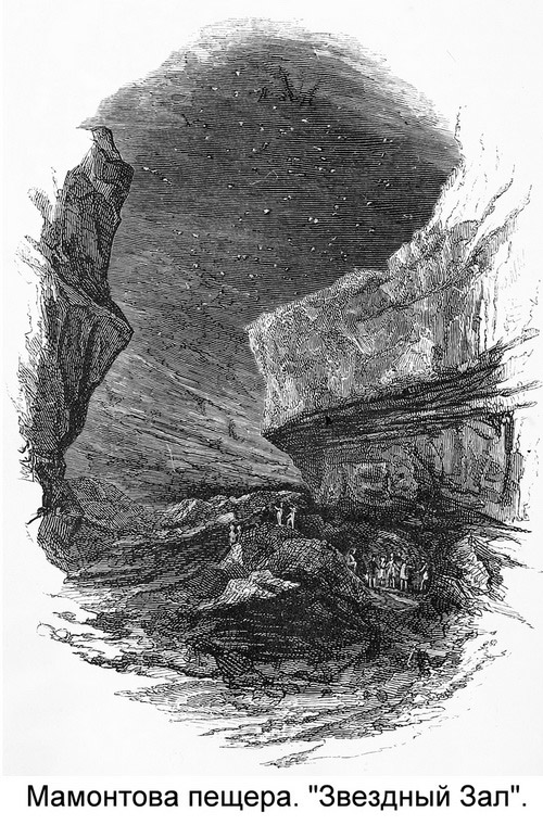 В первый раз мы увидели «Звездный Зал» с потушенными огнями. Это дало нам возможность почувствовать «видимость тьмы». Казалось, что перед нашими глазами и есть сама плотная чернота тьмы. Не было видно ничего далее четверти дюйма. Если бы кто-то остался здесь один, его разум долго бы не продержался. Даже несколько часов такого полного отсутствия любого света, возможно, могли бы сломить его. На бесконечном множестве небольших участков потолка темный гипс осыпался, обнажив ярко-белый слой известнякового потолка, таким образом, создав подобие звезд. Когда зал был освещена, эта иллюзия стала совершенной. Казалось, мы стояли на дне глубокого каменного колодца и смотрели на звездный небосвод. Факел медленно повернулся, чтобы бросить тень на потолок – и мы увидели плывущее по небу облако – и это было настолько красиво, что невозможно найти слова описать это. «Звездный Зал» является самым прекрасным произведением всей этой великой галереи Природы.
