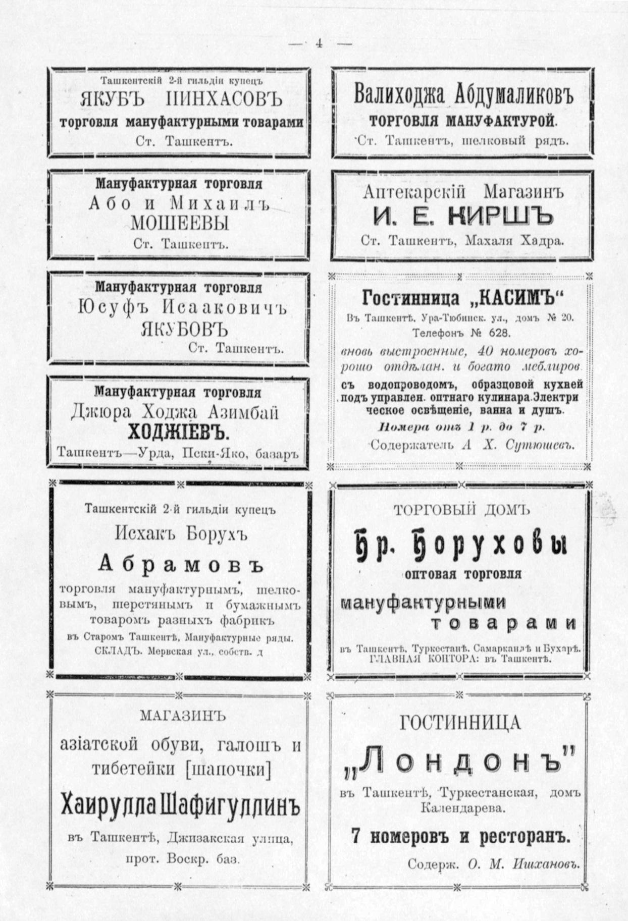 Реклама магазинов (Дмитриев-Мамонов А. Путеводитель по Туркестану и Средне-Азиатской железной дороге. СПб.: Министерство путей сообщения, 1912. C. 4 вкладки)