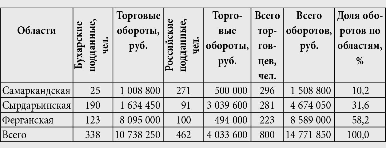 Хотя, как отмечено в таблице 1, в Самаркандской области в 1899 году проживала почти половина (47,6 %) всех бухарских евреев края, предпринимателям из их числа удавалось совершать гораздо большие торговые обороты в двух других коренных областях Туркестана. Это хорошо видно из таблицы 3, составленной на основе сведений, собранных по указанию Государственного совета[455]455