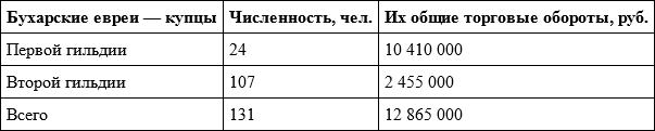 ЦГА Узбекистана. Ф. 1. Оп. 18. Д. 14. Л. 40. Данные, собранные уездными администраторами края, и те, что были представлены Туркестанской казенной палатой, противоречат друг другу в отношении общих торговых оборотов русскоподданных бухарских евреев, имеющих статус туземных евреев и вступивших в русское подданство. Если верить уездным чиновникам, то получается, что общие торговые обороты (даже с устранением допущенных занижающих ошибок) всех 462 торговцев составляли в 1892 году 4 033 600 рублей (см. предыдущую таблицу), в то время как, по сведениям Туркестанской казенной палаты, только у 82 купцов первой и второй гильдий этих двух категорий общий торговый оборот равнялся 5 млн 785 тыс. рублей. Ошибки и приблизительность оценок, которыми отличаются данные некоторых уездных начальников, дают основание предположить, что сведения Казенной палаты больше соответствуют действительности. Вместе с тем обнаруженное противоречие не позволяет выявить долю мелких торговцев среди общего числа торговцев двух указанных категорий.