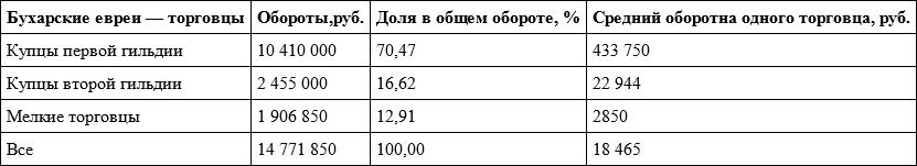 Из таблицы 5 следует, что в 1892 году в общей сумме торговых оборотов бухарских евреев всех категорий в крае львиная доля (70,47 %), так же как и в Самарканде, принадлежала крупным купцам.