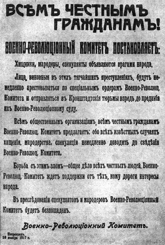 Ввиду этой угрозы, все те, кто хотел нажиться на голоде масс, стали скрываться. Позже для борьбы со спекулянтами и другими врагами нового, советского строя была создана Чрезвычайная комиссия (ЧК).