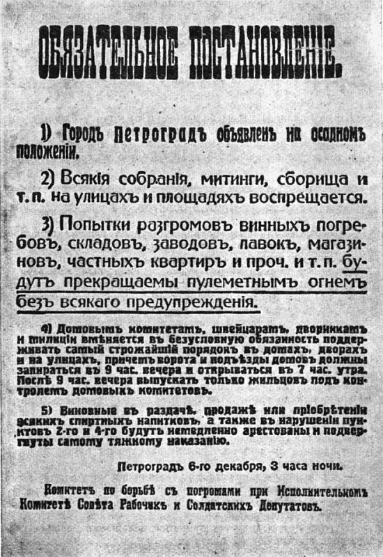 Чтобы покончить с этими погромами, большевики пустили в ход пулеметы, расстреливая бутылки со спиртным – бить их иным путем не было времени. В подвалах Зимнего дворца уничтожили вина на 3 миллиона рублей, причем некоторые из хранившихся там сортов были столетней давности. Спиртное вытекло из погребов, но не через глотки царя и его приспешников, а через пожарные шланги в канал. Убыток чудовищный. Большевики глубоко сожалели о нем, поскольку нуждались в деньгах. Но еще больше им нужен был порядок.