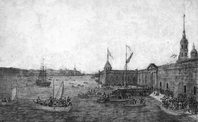 В сие время оба берега бывают покрыты множеством зрителей, с нетерпением ожидающих первого выстрела из крепости. Он раздался – и Нева покрывается судами, и там, где за час мертвое молчание дремало на глыбах льда и снега – там все теперь изображает вид пробужденной природы, и самые воды, кажется, торжествуют свое освобождение. <…> Поистине картина сия чрезвычайно богата и ее можно всего ближе уподобить обручению венецианского дожа с Адриатическим морем. <…> В день Преполовения и 1 августа бывают в крепости крестные ходы для водоосвящения, при чем собирается великое множество всякого звания людей и Нева покрывается разноцветными шлюпками. В первый день всякому позволяется гулять по крепостным валам3131