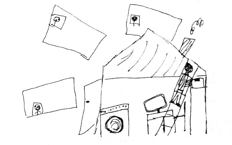 В верхней части листа – самолет, над ним стоит женщина, а снизу, протягивая к ней волшебную палочку, держа под мышкой что-то вроде большой книги, летит миниатюрная Мэри Поппинс – мне показалось, что у нее лицо Гилье. А по небу разбросаны квадратики, и в каждом, в уголке, маленькое окно, из которого выглядывает чье-то лицо. В доме – стиральная машина, за спиной мужчины, у двери, высокий шкаф, на шкафу – коробка, к стене прислонена лестница. Весь лист по диагонали пересекает слово «Суперкалифрахилистикоэспиалидосо».
