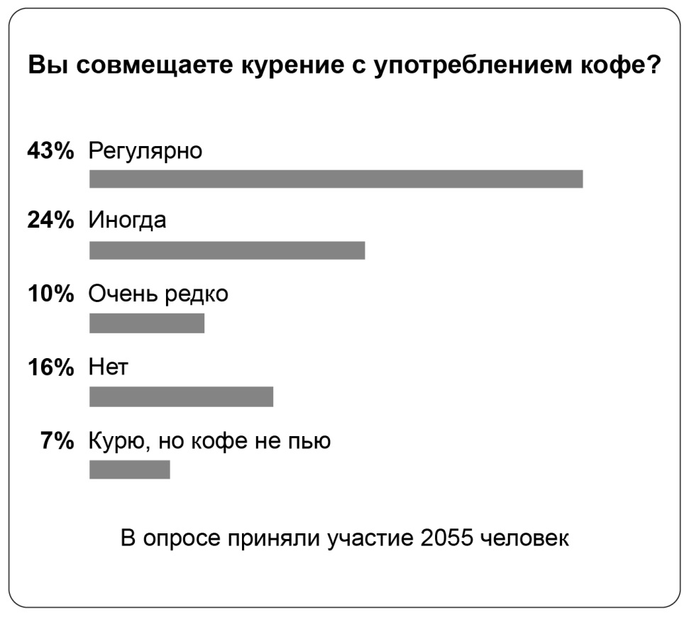 Когда вы курите и пьёте кофе – вы одновременно удовлетворяете две потребности: временно убираете чувство нехватки никотина и получаете порцию допинга от кофе. Автоматически создаётся связка кофе-сигарета.