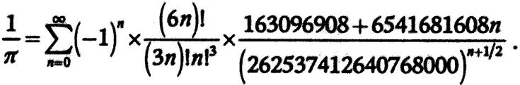 В духе Рамануджана в 1980-х годах математики Грегори (Григорий) и Дэвид (Давид) Чудновски (урожденные украинцы) сконструировали даже еще более зверскую формулу. Каждый новый член в ней прибавляет примерно 15 цифр: