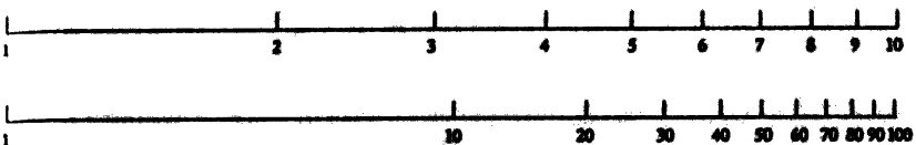 Если нанести числа от 1 до 10 на линейку, расположив их в соответствии со значениями их логарифмов, то получится приведенная ниже картина, которую можно продолжить, скажем, до 100:
