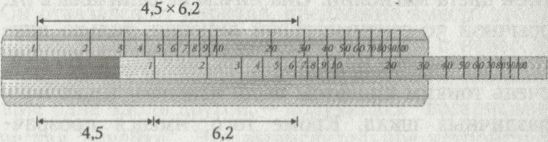 Умножение двух чисел с помощью логарифмической линейки – операция совсем не сложная, при этом даже не требуется понимать, что такое логарифмы. Пусть, например, я собираюсь умножить 4,5 на 6,2. Мне надо сложить длину, отмеченную как 4,5 на одной линейке, с длиной, отмеченной как 6,2 на другой. Для этого я сдвигаю среднюю подвижную часть линейки так, чтобы 1, нанесенная на ней, совпала с точкой 4,5 на основной линейке. Результат этого умножения находится в точке на основной линейке, стоящей напротив числа 6,2 на средней линейке. Все понятно из рисунка: