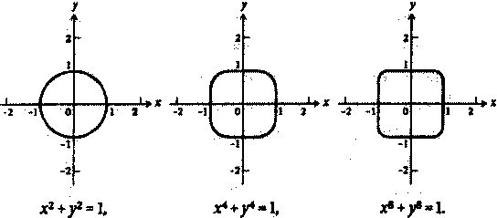 На самом деле, чем большее мы выберем число n,тем ближе полученная кривая будет к квадрату. В пределе, когда x ∞+ у ∞= 1, уравнение описывает квадрат. (Если что-то и заслуживает названия квадратуры круга, то это как раз тот самый случай.)