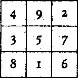 Ключевое событие в истории занимательной математики, как считается, произошло на берегах Желтой реки, Хуанхэ, около 2000 года до н. э. Однажды китайский император наблюдал, как черепаха выползает из воды. То была священная черепаха, с черными и белыми пятнышками на брюхе, которые соответствовали первым девяти числам и образовывали на черепашьем брюхе табличку, которая (если вместо точек подставить арабские цифры) выглядела следующим образом: