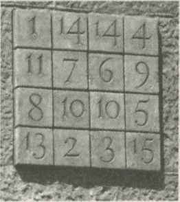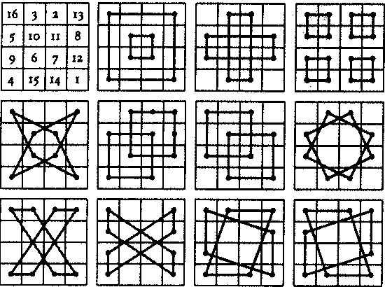 Одна из привлекательных черт магических квадратов состоит в том, что они могут иметь любой размер, не обязательно только 3 × 3. Знаменитый пример – квадрат 4 × 4, который использовал в своем творчестве Альбрехт Дюрер. В композицию гравюры «Меланхолия I» он включил квадрат 4 × 4, получивший такую известность потому, что в него встроен год создания гравюры – 1514. На самом деле это сверхмагическийквадрат – в нем не только строки, столбцы и диагонали дают в сумме 34, но также и все комбинации из четырех чисел, отмеченных точками и соединенных в квадратах на рисунке.