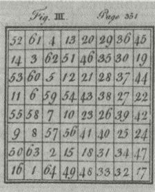 Немало времени можно провести, забавляясь с магическими квадратами и восхищаясь их структурой и гармонией. На самом деле ни одна другая область непрактической математики не привлекала столько любителей математики на протяжении столь многих лет. В XVIII и XIX веках литература по магическим квадратам расцвела пышным цветом. Одним из самых именитых энтузиастов был Бенджамин Франклин. В молодости он забавлялся составлением магических квадратов, пытаясь скрасить скучные часы на службе в Законодательном собрании штата Пенсильвания. Самый известный его квадрат имеет размер 8 × 8 (см. рис.), и считается, что он придумал его еще мальчишкой.