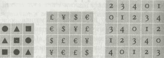 [Закрыть]. (Он к тому времени практически полностью ослеп, из-за чего его исследования в области, существенным образом использующей пространственное расположение чисел, представляются особенно впечатляющими.) В частности, он изучал модифицированный вариант магического квадрата, в котором каждое число или символ появляется только один раз в каждой строке и каждом столбце. Он назвал такие квадраты «латинскими».