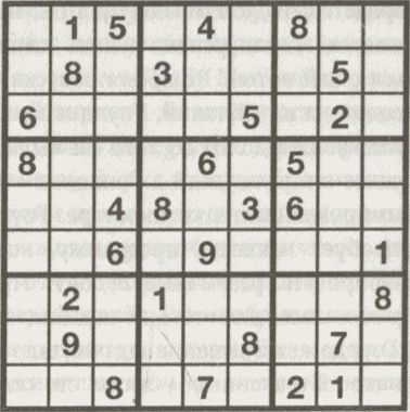 Маки Кадзи – представленный мною в начале главы японец, который занимается созданием головоломок, – открыл новую эру в играх с числовыми квадратами. Идея посетила его, когда он просматривал один американский журнал головоломок. Поскольку английский – не его родной язык, он пролистывал страницы малопонятных игр, использующих слова, пока не наткнулся на загадочно выглядевшую сетку из чисел. То была головоломка под названием «Поставь числа на место». Она представляла собой частично заполненный латинский квадрат 9 × 9, в котором использовались цифры от 1 до 9. Рассуждая логически, игрок должен был заполнить пустые места числами, помня, что каждое число может появиться в каждой строке и каждом столбце только один раз. Задача облегчалась дополнительным условием: квадрат был разбит на девять подквадратов 3 × 3, выделенных жирным шрифтом. Каждое из чисел от 1 до 9 могло появляться в подквадрате лишь единожды. Кадзи решил головоломку «Поставь числа на место» и очень воодушевился – именно головоломки подобного типа он и хотел размещать в своем новом журнале.
