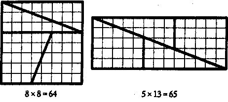 Это свойство лежит в основе магического фокуса возрастом в несколько сотен лет. Фокус состоит в том, что квадрат, состоящий из 64 единичных квадратов, можно разрезать на четыре куска так, что, сложив их по-другому, мы получим прямоугольник из 65 единичных квадратов. Вот как это делается: нарисуем квадрат, составленный из 64 маленьких квадратиков. Сторона большого квадрата имеет длину 8. В последовательности Фибоначчи два F-числа, идущие перед 8, – это 5 и 3. Разделим большой квадрат на куски, используя длины 5 и 3. Куски можно сложить по-другому в прямоугольник со сторонами длиной 5 и 13, и площадь этого прямоугольника равна 65: