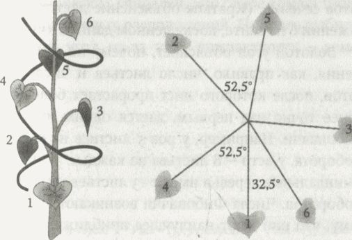 По мере роста стебля каждый новый лист появляется под фиксированным углом относительно предыдущего листа. Это угол, при котором количество солнечного света максимально. Он не равен 180 градусам (половине полного оборота), потому что тогда третий лист окажется в точности над первым. Не равен он и 90 градусам (четверти полного оборота), поскольку тогда пятый лист оказался бы ровно над первым, а кроме того, первые три листа использовали бы только одну сторону стебля, что было бы недопустимой растратой солнечного света, падающего на другую сторону. Оказывается, угол, обеспечивающий наилучшее расположение листьев, – 137,5 градуса.
