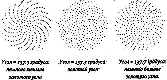 Но самым поразительным образом уникальные свойства золотого угла проявляются в расположении семян. Представим себе, что семена сначала возникают в центре цветка, и далее ряды следуют, заворачиваясь под фиксированным углом. Новые семена выталкивают старые все дальше и дальше от центра. На рисунке показаны различные расположения семян, возникающие при различных величинах этого угла: немного меньше золотого, в точности равный ему и чуть-чуть больше.