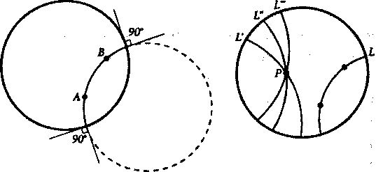 На левой картинке внизу изображена прямая линия между точками А и В, для нахождения положения которой надо построить окружность, проходящую через точки А и В и входящую в диск под прямым углом. Гиперболический вариант постулата о параллельных утверждает, что для каждой прямой Lи точки Pвне этой прямой имеется бесконечно много прямых, параллельных L, которые проходят через P.Это показано на рисунке внизу справа, где отмечено три прямых – L', L''и L''', – которые проходят через точку P, но при этом все параллельны прямой L. Линии L', LL''и L'''представляют собой части различных окружностей, которые входят в диск под прямыми углами. Глядя на рисунок, можно понять, как может получиться, что имеется бесконечно много прямых, параллельных Lи проходящих через P, – просто потому, что можно нарисовать бесконечное число окружностей, которые входят в диск под прямыми углами и проходят через P. Модель Пуанкаре, кроме того, помогает нам понять смысл утверждения о том, что две параллельные линии расходятся: Lи L'параллельны, но становятся все дальше и дальше друг от друга по мере приближения к краю диска.
