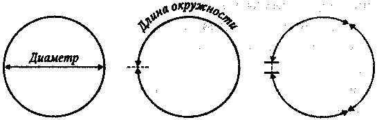 Уже в античные времена люди понимали, что отношение длины окружности к ее диаметру всегда одно и то же, независимо от величины окружности. Это отношение известно как число π, его величина – чуть больше трех. Так что если вы возьмете диаметр окружности и, слегка изогнув, приложите его к самой окружности, то окажется, что он укладывается в ней три с небольшим раза.