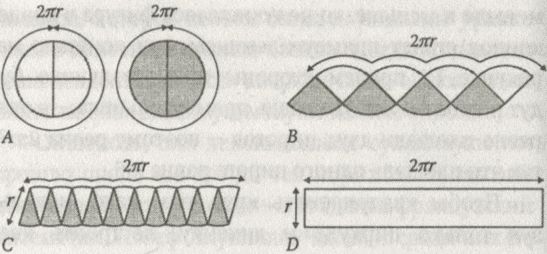 Открытие Линдеманна было ключевым моментом в теории чисел. Оно также раз и навсегда решило проблему, являвшуюся, пожалуй, самой знаменитой нерешенной задачей в математике: можно ли квадрировать круг или этого сделать нельзя. Но чтобы объяснить, как это следовало из результата Линдеманна, надо ввести уравнение, которое гласит, что площадь круга есть πr 2,где r —радиус. Наглядное доказательство, почему это так, представляет собой тот случай, когда лучшей метафорой для числа πявляется пирог. Представьте себе, что у вас два круглых пирога одного и того же размера, белый и серый, как на рисунке А. Длина окружности каждого пирога – произведение πи диаметра, то есть π,умноженное на удвоенный радиус, или 2 πr.После разрезания на равные сегменты куски можно сложить по-другому, как показано на рисунке В (там взяты четвертинки пирогов) или С (где пироги порезаны на десять кусков каждый). В обоих случаях длина стороны остается равной 2 πr.Если делать куски все меньше и меньше, то получившаяся фигура в конце концов станет прямоугольником, как показано на рисунке D, причем стороны прямоугольника будут равны rи 2 πr. Площадь прямоугольника – а она равна площади двух пирогов – поэтому равна 2 πr 2,так что площадь одного пирога равна πr 2.
