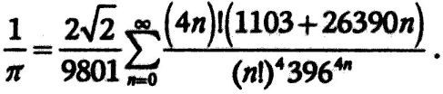 Рамануджан был по сути математиком-самоучкой. Однажды он написал письмо профессору Кембриджского университета Г. X. Харди. Харди, ошеломленный тем, что Рамануджан сам переоткрыл результаты, получение которых заняло столетия, пригласил его в Англию, где они и работали вместе вплоть до смерти Рамануджана, в возрасте 32 лет. В своих работах Рамануджан продемонстрировал потрясающую интуицию в том, что касается свойств чисел, включая и число π,а его самая знаменитая формула такова: