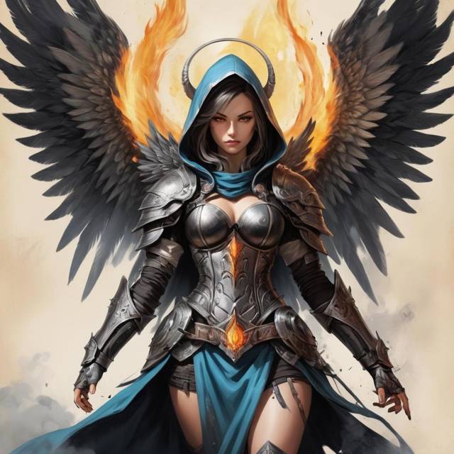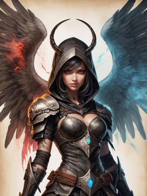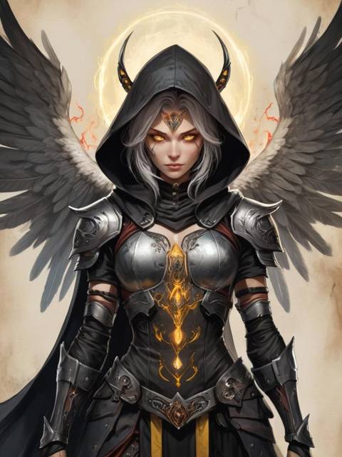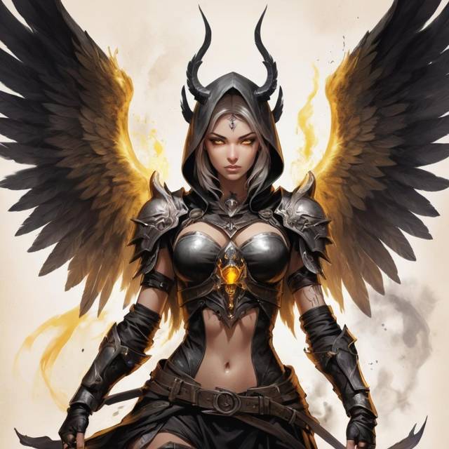 Сначала, когда выпрямился и развернулся к ангелам лицом, я осмотрел ту, которая являлась старшей. У неё было две пары рогов. Причём росли как-то странно. Одни были маленькими, внешними, вторые большими, извилистыми, стремящимися вверх. Во лбу был синий камень, точно не сапфир… я такого ранее не видел. От него исходили волны, которые, похоже, позволяли сопротивляться порче демонов. Глаза светились золотым, вокруг неё витала золотая аура. Вот только крылья были чёрными, словно обожжёнными. Сама же она была частично облачена в броню, а в её груди, над солнечным сплетением, был вживлён ещё один камень, который переливался то красным цветом, то золотым, иногда отдавая чёрным. Её лицо… оно было приятным, притягательным. Строго изогнутые тонкие чёрные брови, белокурые волосы под капюшоном красиво обрамляли её лицо. Тонкий носик, жёсткий взгляд, немного впалые щёки, видимо, из-за голода, а также пухлые губы. Мне её внешность нравилась.