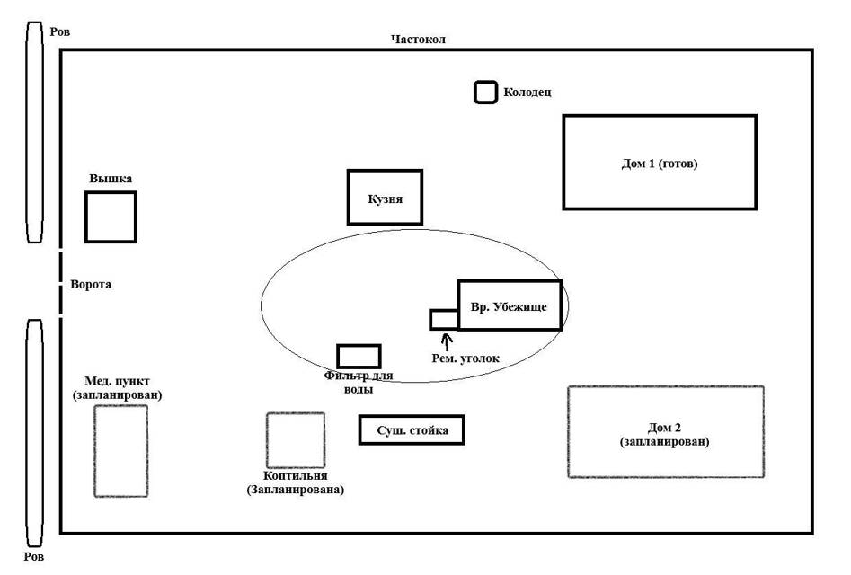 Также расчистили места для медицинского пункта небольшого, коптильни, определили, где в будущем будет стоять второй дом. Примерное расположение… мне нравилось. Но при этом придётся засыпать яму с временным убежищем, переносить ремонтный уголок, фильтр для воды. В общем… работы было ещё много, но она продвигалась, что мне нравилось.