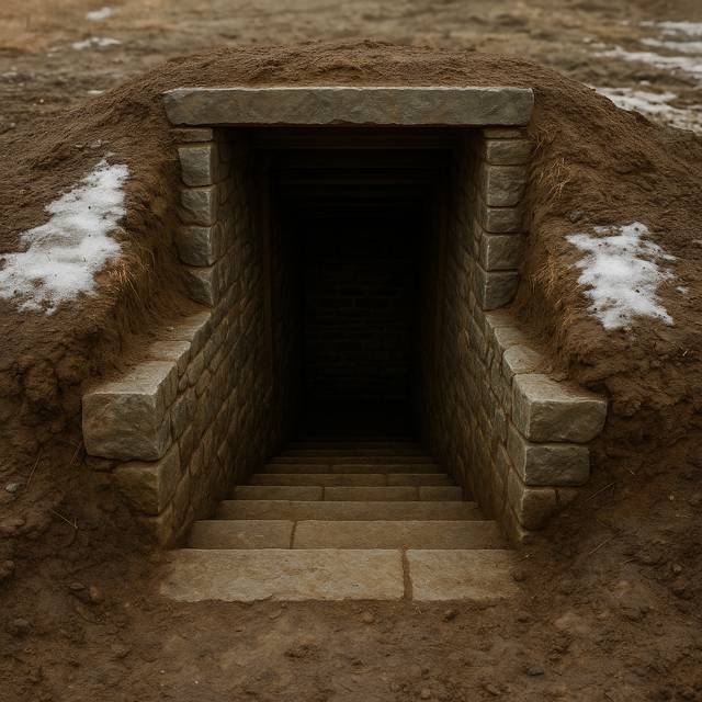 Под вечер именно этого дня всё было готово, оставались сущие мелочи. Каменные ступеньки сделаны, вход из камня сложен. Не хватало дверей, но Грегор их сделает завтра. Землю я засыпал и осторожно, чтобы не продавить, утрамбовал. И по итогу уже сейчас можно было спуститься вниз и почувствовать небольшую разницу температур. А со временем она будет только увеличиваться.