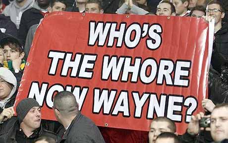 Плакат фанов «МЮ»: «Кто теперь шлюха, Руни?»