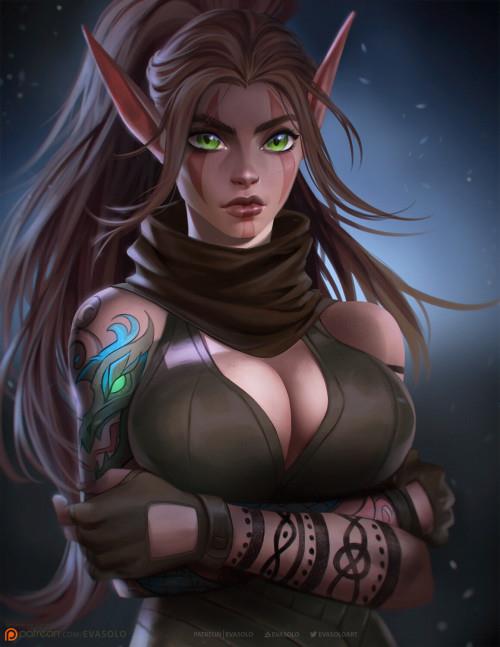 Она действительно была не высокого роста. Едва доставала мне до плеча. Аккуратная, небольшая попка, тонкая талия, и внушительная пышная грудь, которая покачивалась при каждом движение, притягивая к себе взгляд. Соблазнительная фигурка, была затянута в, болотного цвета, комбинезон без рукавов, но с глубоким декольте. Очень глубоким… Просто неприлично глубоким! Блин, глаза сами пялятся на эти, едва прикрытые тканью, дыньки! Дополняли наряд беспалые перчатки и широкий воротник-маска. Еще я заметил пару татуировок. На правой руке, начиная с плеча и заканчиваясь на запястье, разместился яркий рисунок какого-то мифического создания. Кстати, чем-то напоминающего дракона! На левой, от запястья до локтя, красовался обычный черный узор. Может, он и имел какой-то смысл, но от меня он был скрыт. Но больше всего, помимо большой груди, меня привлекло лицо эльфы. Довольно миловидное, даже хмурость его не портила. Немного пухлые, красиво очерченные губы. Чуть вздернутый носик. Слегка раскосые, невероятно яркие, зеленые глаза, которые эффектно оттенялись длинными каштановыми волосами, собранными в высокий хвост. Но заинтересовало меня не вот это вот все, а три красных полосы на смуглой коже. Две из них, напоминающие полумесяцы, пересекали глаза и заканчивались на щеках. А третья начиналась с нижней губы и скрывалась где-то под подбородком. Хм-м-м…
