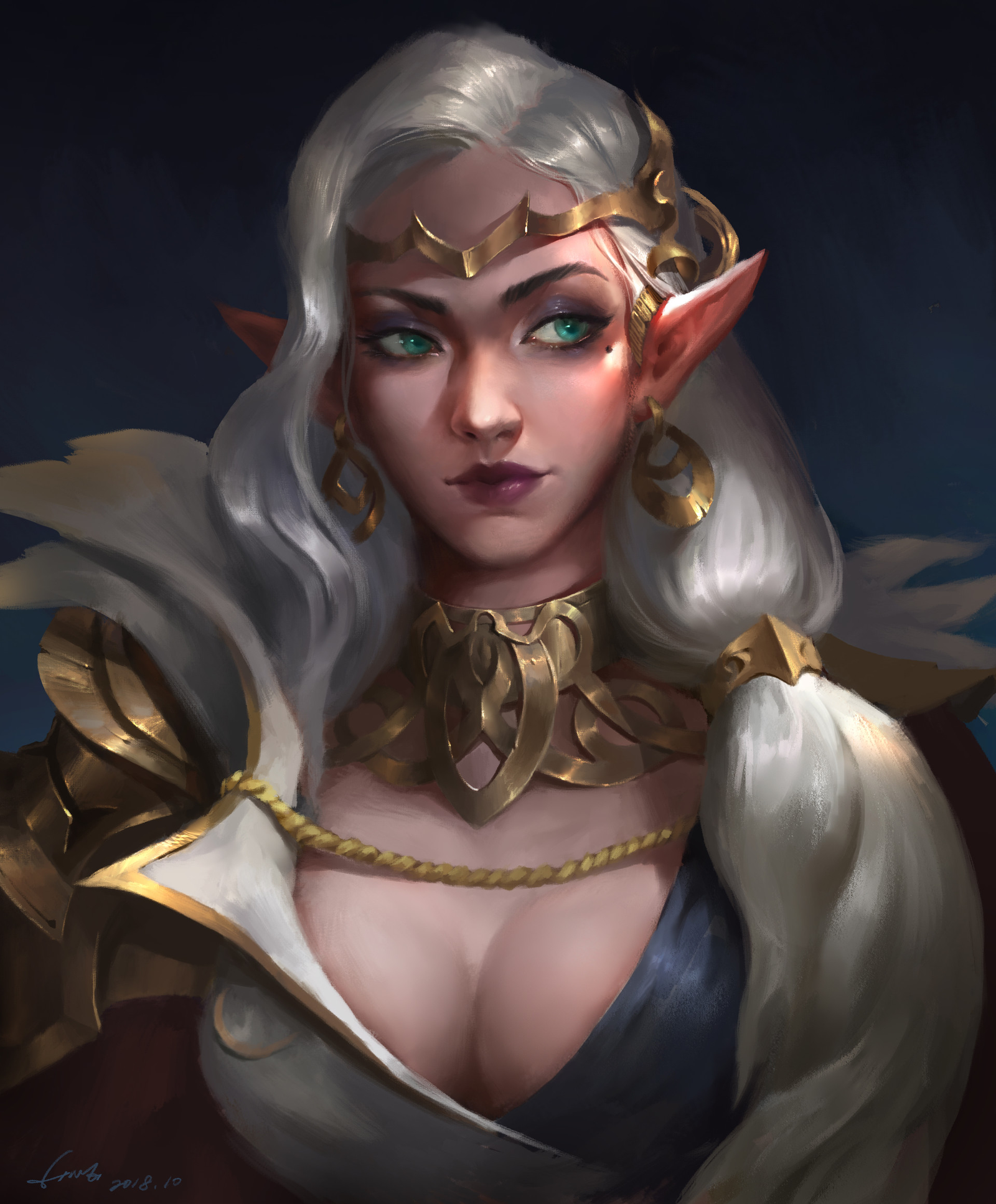 Она буквально приковывала к себе взгляд. Высокая, статная, поджарая, с аристократически бледной кожей, несмотря на жизнь, грубо говоря, под открытым солнцем. Строгий костюм, с металлическими вставками, плотно облегал точеную фигуру, подчеркивая все ее достоинства. В особенности высокую, упругую грудь, что соблазнительно выглядывала из глубокого декольте. Серебристые волосы были перехвачены золотым кольцом и перекинуты через плечо. Подобно шелковистому водопаду, они ниспадали до тонкой талии. Изящную шею украшало широкое плетеное ожерелье из желтого металла, а в тон ему слегка оттягивали мочки ушей массивные округлые серьги. На хладнокровном лице, с чуть заостренными чертами, особенно выделялись недовольно поджатые губы и безумно выразительные изумрудные глаза, которые, казались, без труда заглядывают в самые потаенные уголки души. Довершением образа служил золотой венец, который добавлял ему величия и суровости.