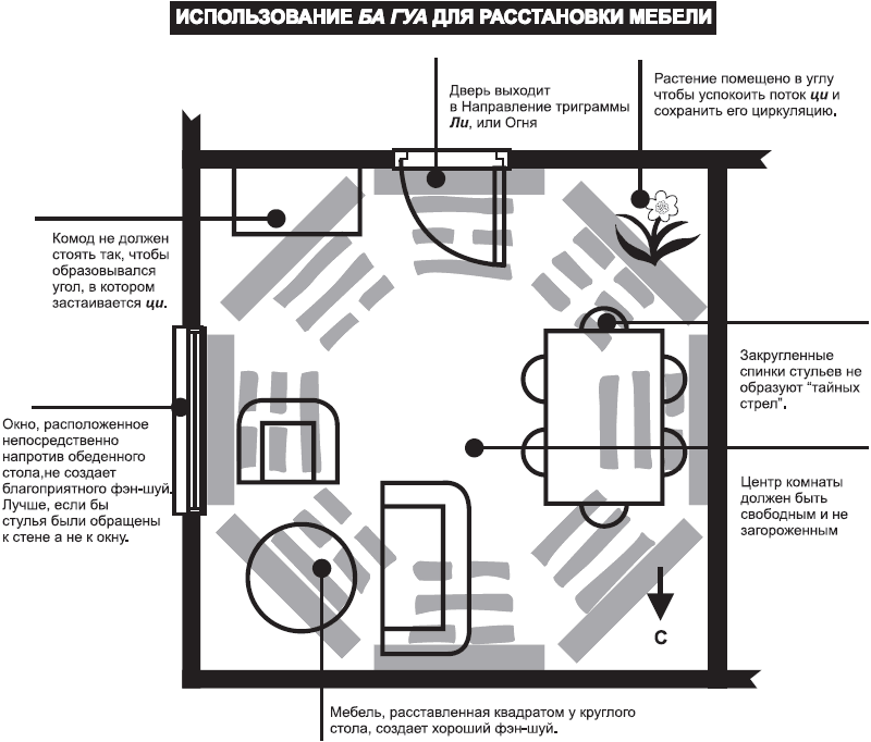 Потоки ци в комнате должны вытекать легко и без препятствий, и лучше, если через вторую дверь. Мебель можно расположить круговыми, восьмиугольными или квадратными группами посередине помещения. Постарайтесь разместить большую часть мебели параллельно стенам. Если в стульях имеются зазоры или отверстия, нельзя чтобы их направление совпадало с направлением окон или дверей, то есть они не должны быть обращены к ним. Так же нежелательно, чтобы спинки кресел, стульев или дивана были обращены к входной двери гостиной.