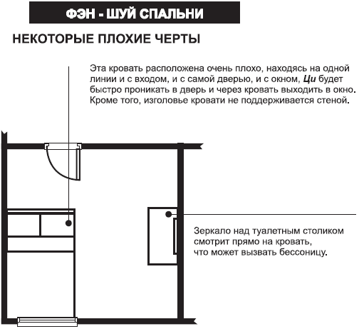 Большие шкафы или другие предметы интерьера не следует ставить вблизи кровати. Туалетный столик, если его расположить напротив кровати вызовет неудачи и ссоры в семье, он также не должен быть повернут в сторону зеркала или кровати. Не следует ставить его напротив окна. Когда невозможно исключить вышеназванные проблемы, поставьте на зеркале красные точки, либо обведите его красной линией.