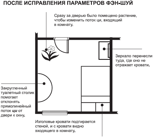 Также нежелательно видеть из окна открытый пустырь, высокие деревья, здания или холмы. Лучше задрапировать окна шторами. Спальня не должна располагаться прямо около входной двери в дом, иначе обитатели будут часто болеть и уставать, либо спать в больших количествах. Нейтрализовать этот негативный фактор можно, если на дверь спальни повесить зеркало, либо «музыку ветра» над дверью.