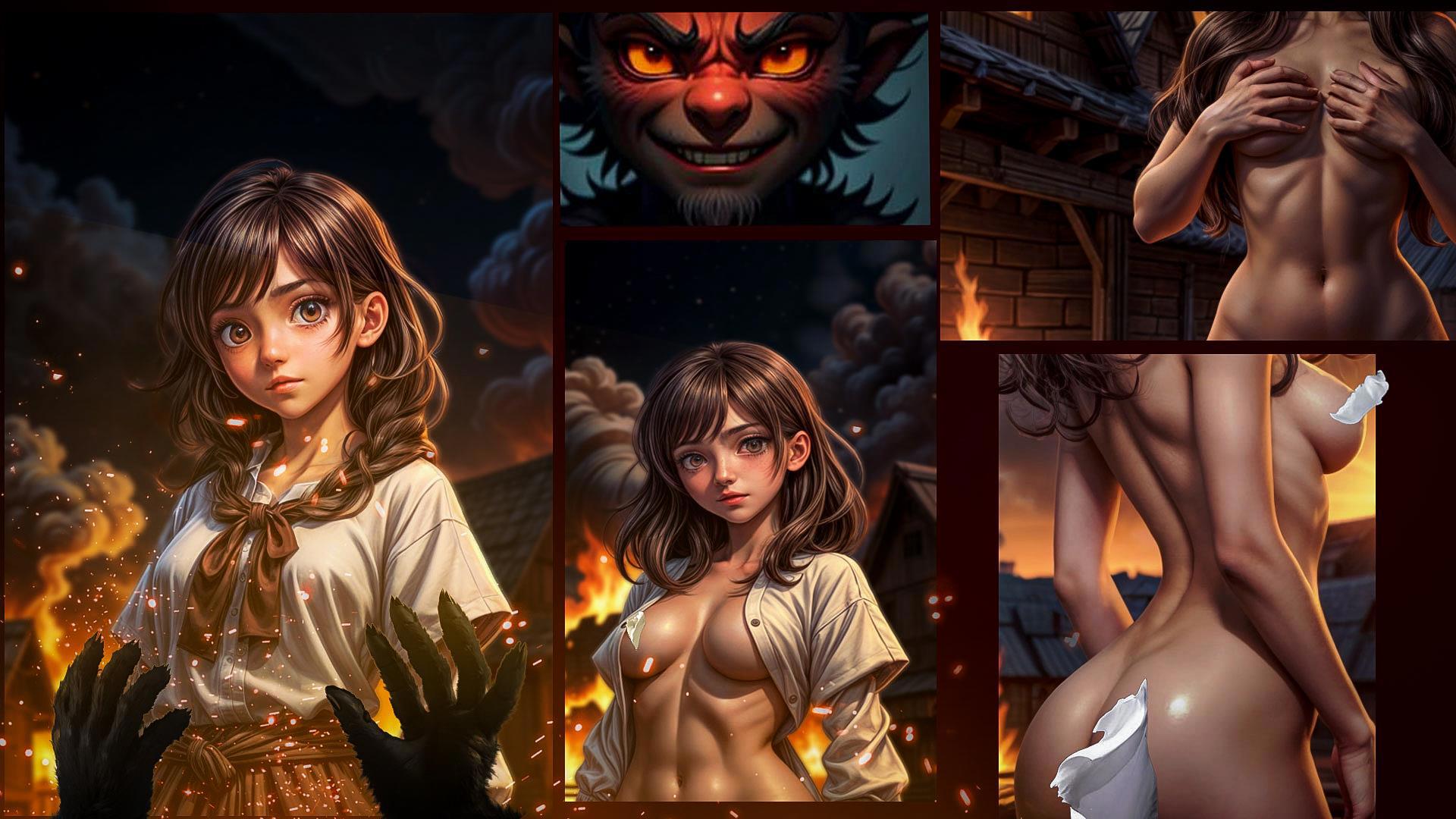 Ткань затрещала, расходясь и обнажая смуглое подтянутое тело. Торчащая грудь с вздернутыми темными сосками гордо вздымались в оранжевых отсветах пламени пожара. Плоский живот перетекал в мохнатый треугольник, Девушка завизжала.