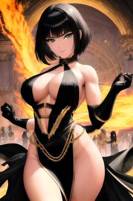 В целом – фигурка у девушки бомбовая. Пышная грудь, осиная талия и сочные бедра. Разглядеть мне удалось все изгибы ее тела, потому как на ней было надето открытое платье, если эти лоскуты черной ткани вообще можно было так назвать. Разрезы по бокам начинались от самой талии и оголяли ее округлые бедра, на которые игриво свисали золотые цепи. От талии тянулись два лоскута ткани, закрывающие лишь пару самых интересных сантиметров на груди красотки. Крепились лоскуты на кожаный ошейник на шее.