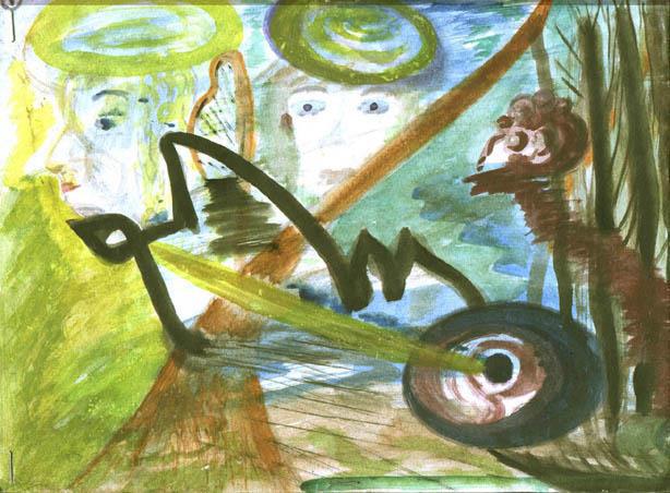 Танец занял минут двадцать и сразу меня потянуло рисовать. Большой лист ватмана покрылся рисунком и красками всего за полчаса. Какое счастье я испытывала при написании этой картины – не могу ни с чем сравнить. Божественный восторг, неземное блаженство – нет в моем лексиконе слов, которые могли бы помочь вам прикоснуться к тому состоянию сказочного упоения, испытанного мною при нанесении линий и красок (Приложение 3).