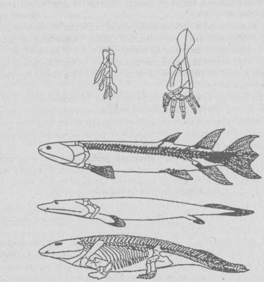 То, что они отличались друг от друга все больше, неудивительно. Удивительно другое: несмотря на очень дальнее родство, они независимо, параллельно приобрели такие важные признаки наземных животных, как обособление головы от туловища, появление шеи, особого подвижного затылочного сочленения. Одна из костей черепа кистеперой рыбы независимо у разных «рыбоамфибий» превращается в слуховую косточку: появляется «сухопутное ухо». Даже такой признак, как пятипалая конечность, по мнению современных палеонтологов, могла появиться независимо у предков тритонов и лягушек. Это уж поистине чудо: кисть и стопа всех наземных четвероногих построена поистине по единому плану... Впрочем, кое-какие различия в деталях все-таки есть.