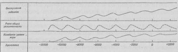 Конечных морен, четких, ясно очерченных, на пути очень многих ледников обычно восемь. (При условии, конечно, что какой-нибудь обвал, или землетрясение, или неудобно крутой склон не «вымарали» одной-двух морен со страниц гляциологической истории. Но в общем в Японии и в Альпах, на Кавказе и Тянь-Шане и во многих других местах число морен стремится к этой цифре.) Это значит, что за последние 15 тысяч лет, то есть за период голоцена – отступления горных ледников, восемь раз ледники прекращали отход и даже наступали. Тут-то и накапливались отдельные конечные морены. Затем ледник снова отходил и оставлял следующую морену – зарубку на память. Восемь циклов за 15 тысяч лет. Так нащупывалась связь между климатическими ритмами и периодичностью сверхприливных эпох.