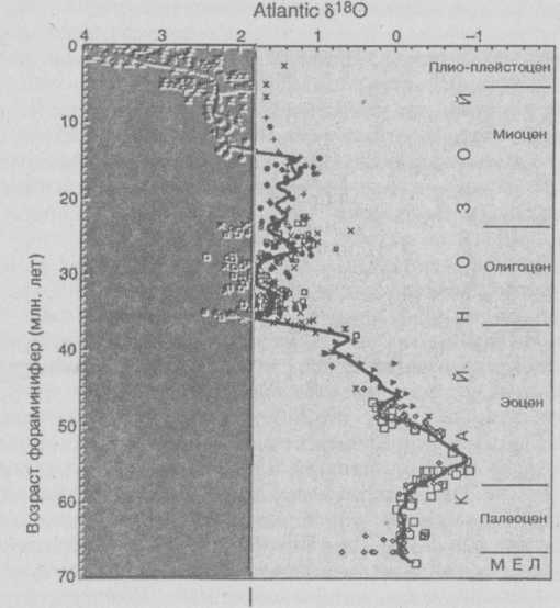 Из золотого века в век вечных зим. Когда в карбонатах откладывается очень мало тяжёлого кислорода, это значит, что на Земле почти перестал работать механизм замерзания-таяния воды, при котором происходит фракционирование и накопление этого тяжелого изотопа. По данным 10 различных исследований морских фораминифер в Атлантике, М. Рэймо и У. Рэддимен нарисовали эту судьбоносную для нашей планеты кривую от мелового периода до наших дней. Вертикальная прямая делит график пополам. Справа – мир без снега и льда, сады у полюсов. Слева – вечные льды. Кардинальный стремительный перелом произошел около 14 миллионов лет назад. Именно в это время зародился ледниковый щит Антарктиды, богатая и разнообразная жизнь этого осколка