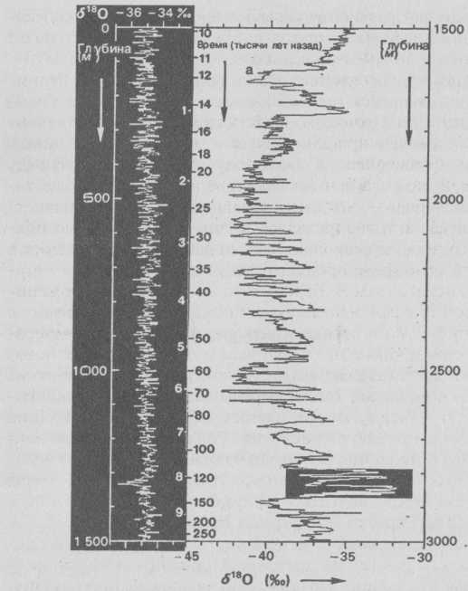 Блестяще еще раз подтвердилась теория Миланковича. Керны, пришедшиеся на интервал с 135 до 115 тысяч лет назад (в Гренландии это 90-метровая колонка льда с глубины 2870– 2780 метров, а в Антарктиде, где осадков, питающих ледниковый щит, выпадает гораздо меньше,– колонка на километр ближе к поверхности)– это математически вычисленное Миланковичем прошлое большое межледниковье, почти одинаково проявившееся в обоих полушариях. По целому ряду показателей, по содержанию тяжелого изотопа водорода, тяжелого кислорода – это была теплая эпоха. В общепланетном масштабе активизировалась жизнь – это косвенно подтвердило резкое, в несколько раз, повышение содержания в тогдашней атмосфере продуктов жизнедеятельности – метана и углекислого газа. В Европе (это выяснили по отложениям некоторых озер) ненадолго установился сухой климат, с пылевыми бурями и лесными пожарами. Разница в температурах по сравнению с предыдущими и последующими похолоданиями достигала восьми – десяти градусов (в Антарктиде разница поменьше). Теплая передышка тогда длилась 20 тысяч лет. От максимума потепления до нового наступления ледника тогда прошло 17 тысяч лет. Сейчас с последнего максимального потепления миновало 9 тысяч лет. Так что у человека, возможно, еще есть в запасе тысяч восемь лет, чтобы решить, как предотвратить расползание ледниковых щитов по просторам Евразии и Северной Америки.